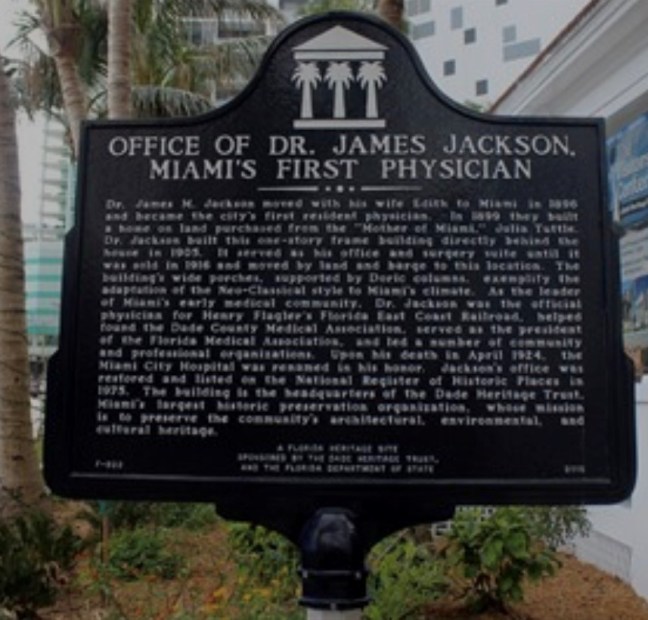 On a random corner in Miami, you’ll run into the historical marker that signifies the location of the site of Miami’s first resident physician: Dr. James M. Jackson. The location housed both his office and the surgery facility. The building was added to the U.S. National Register of Historical Places on February 24, 1975.