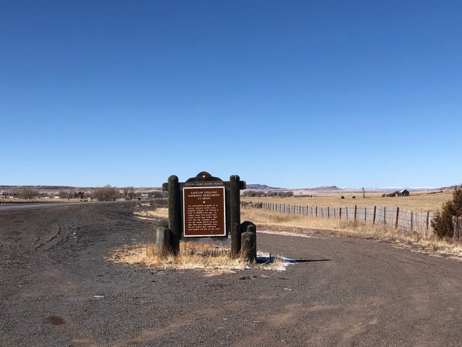 “An outstanding example of an extinct volcanic cinder cone, Capulin Volcano was formed as early as 10,000 years ago. In cinder cones, lava pours from cracks in the base rather than over the top. Capulin itself was the escape hatch for cases that blew lava fragments into the air where they solidified and landed red hot on the cone.”